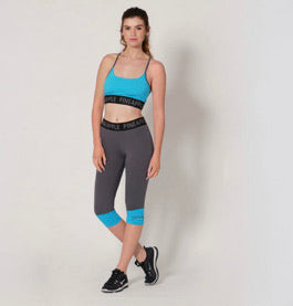 Charcoal grey cropped leggings with Pineapple logo black waistband. Vivid blue flash of colour at bottom of leggings.