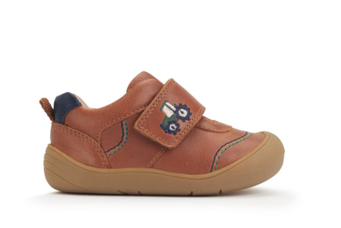 These Harvest shoes in tan leather are the perfect wear-with-anything first walkers. Smart yet casual, and in a neutral colour, for all weather. Plus, the padded ankles and soft insoles give round-the-clock comfort while the rip-tape fastening makes it quick and easy to put on and remove these shoes. Not forgetting the flexible sole which extends up the shoe to offer scuff protection at the toe and heel.