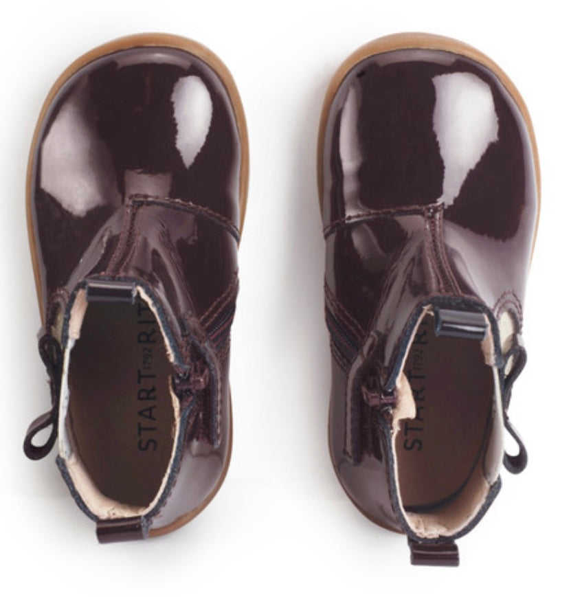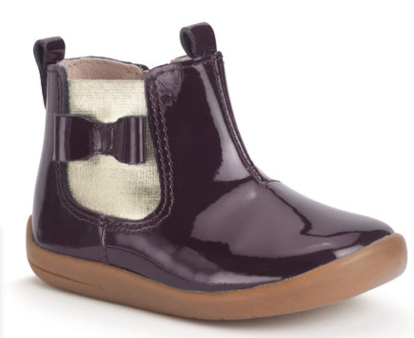 Crafted in a luxurious dark burgundy patent, these first boots are designed to shine as the star of any occasion. The shimmering gold elastic panel adds a playful sparkle to every step, while the securely attached bow offers a charming, girly touch. Beyond their stylish appeal, these boots are thoughtfully designed with a flexible sole featuring biomechanical grooves, promoting natural foot movement and healthy development. With a perfect balance of elegance and practicality, they provide both comfort and support, making them an ideal choice for little feet finding their way.