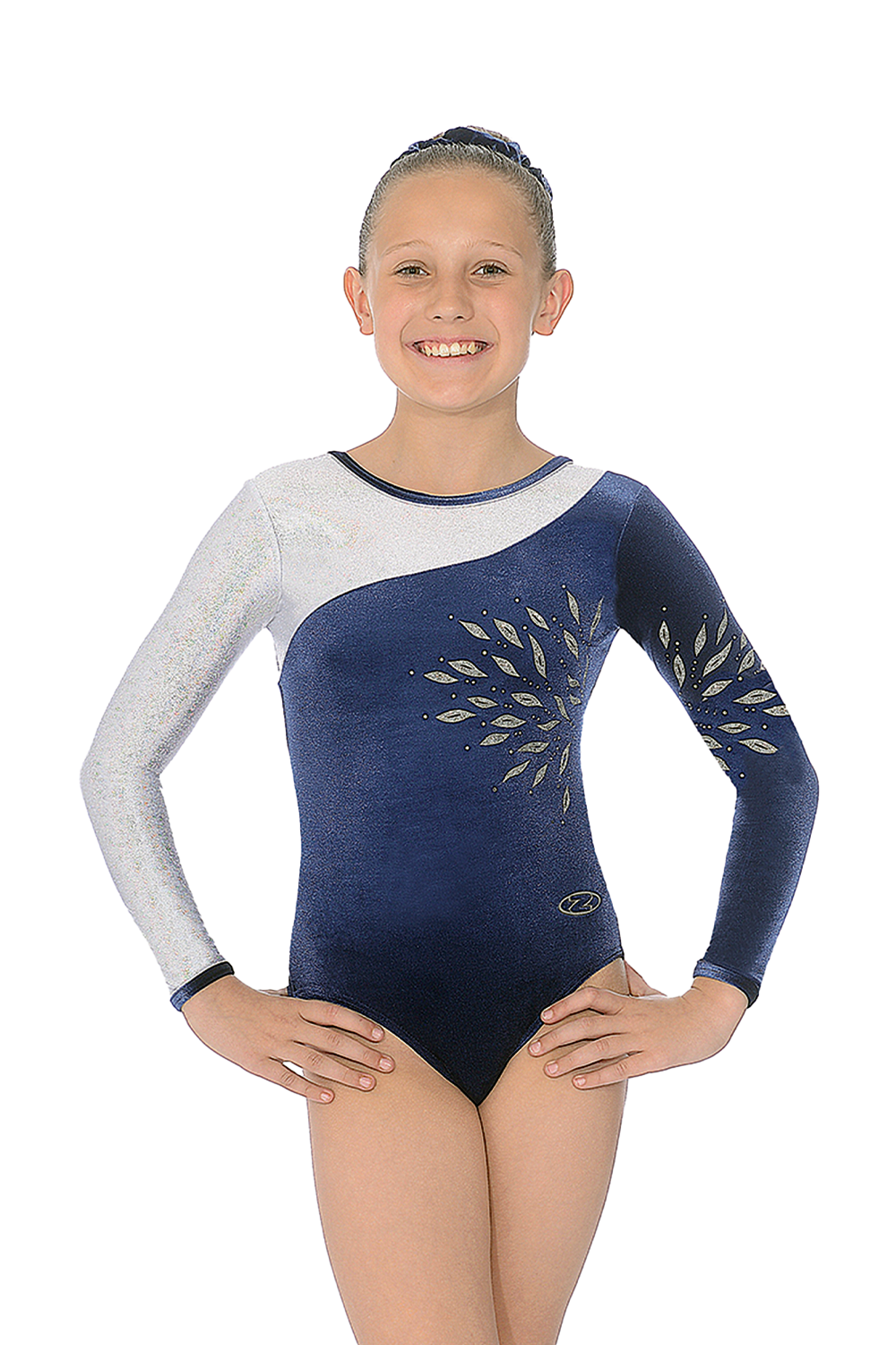 The Eclipse range of long sleeved gymnastic leotards from The Zone. With a round neck design and a spray of crushed crystals to the body and sleeve complimented with panels of super shiny Lycra. The elegant Eclipse leotard has an understated grace. A very popular choice for both clubs and individuals.