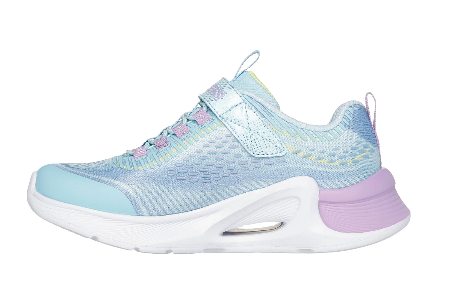 Get active in fun, colorful Skechers Tide Tech trainers. This sporty design features a printed sparkle mesh upper with stretch laces, adjustable riptape , and a well-cushioned colourful midsole with sculpted air window.